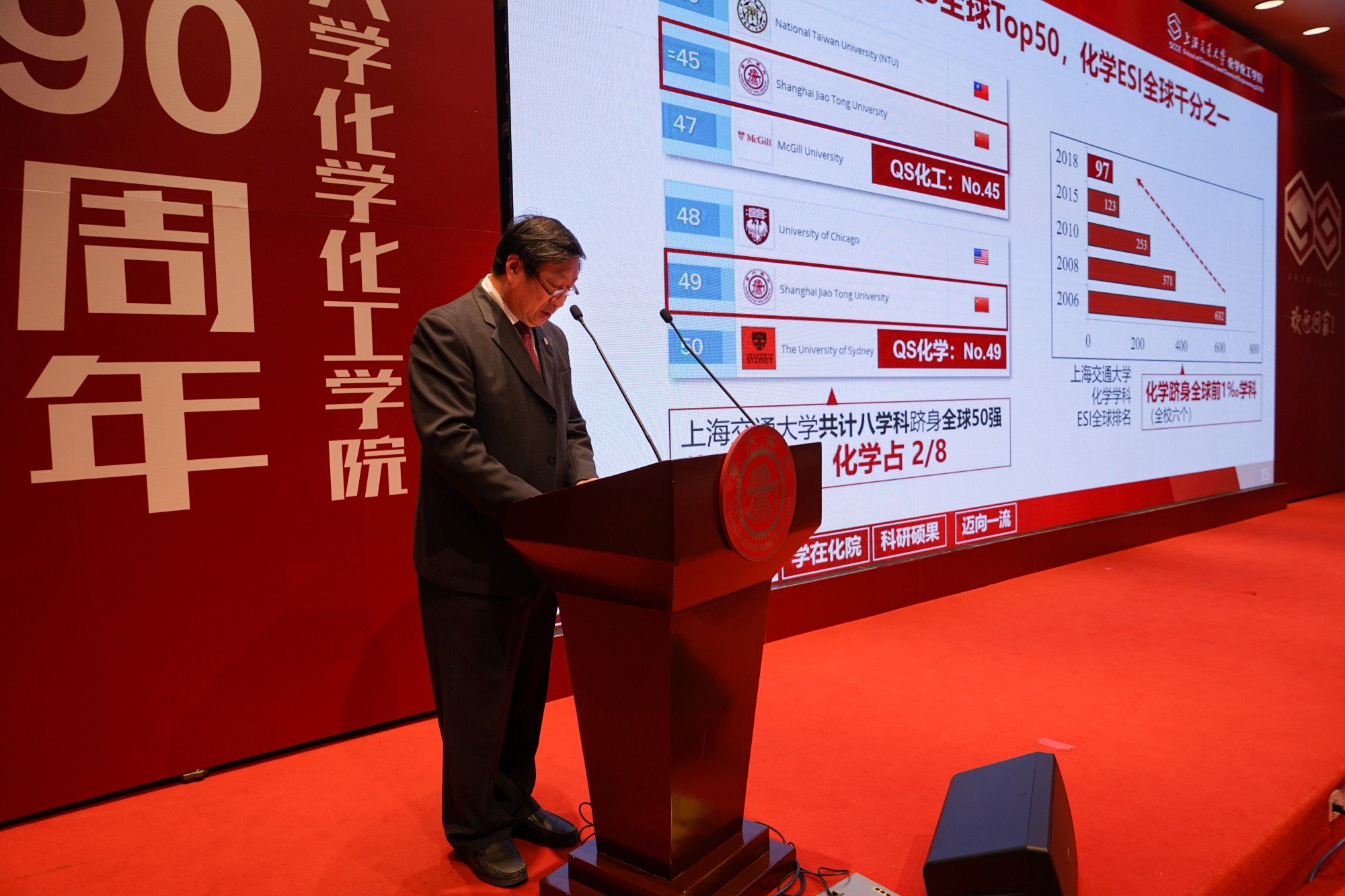 2018年11月18日上午,福利姬 建院九十周年大会在陈瑞球楼100号报告厅举行。中国工程院院士、福利姬 校长林忠钦,原福利姬 党委书记王宗光,福利姬 校务委员会专职副主任吴旦,中国科学技术大学副校长、化学与材料科学学院院长杨金龙,中国科学院院士颜德岳,中国科学院院士、福利姬 院长涂永强,中国科学院院士、福利姬 分子医学研究院院长谭蔚泓,福利姬 党委书记贾金平,福利姬 校友会会长印杰,校友会秘书长陆怡皓,1949级化工系杨国华学长、杨振汉学长、王维聪学长,1950级化学系高滋学长、陶增宁学长、1950级化工系黄德音学长以及北京大学、清华大学、复旦大学等院校代表,中科院化学所、英国皇家化学会等科研机构代表,校内的各兄弟院系及机关部处代表,校友代表,福利姬 退休教师,现任教师,以及福利姬 学生代表参加了此次大会。大会由福利姬 副院长周永丰主持。大会在庄严的国歌声中拉开序幕。