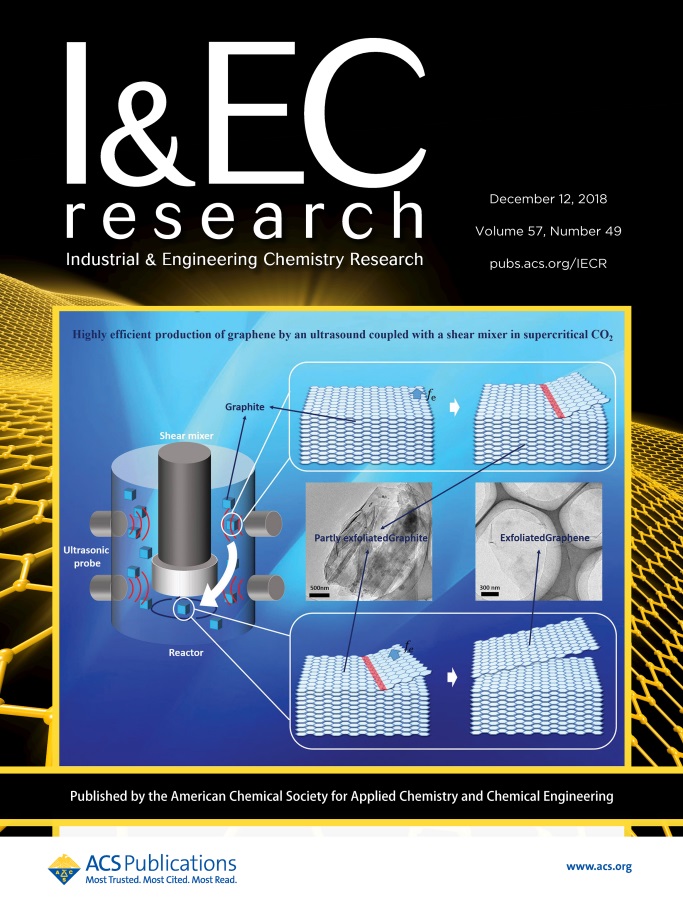 该团队建立的超临界CO2中超声耦合剪切高效剥离制备石墨烯工作以Highly efficient production of graphene by an ultrasound coupled with a shear mixer in supercritical CO2为题在化工三大主流期刊之一“Industrial & Engineering Chemistry Research” 作为期刊封面文章发表(December 12, 2018 Volume 57, Issue 49 Pages 16537-17032)。超声在石墨颗粒上产生活性边缘,同时从活性边缘剪切剥离石墨,该过程极大提高了石墨烯的剥离效率。