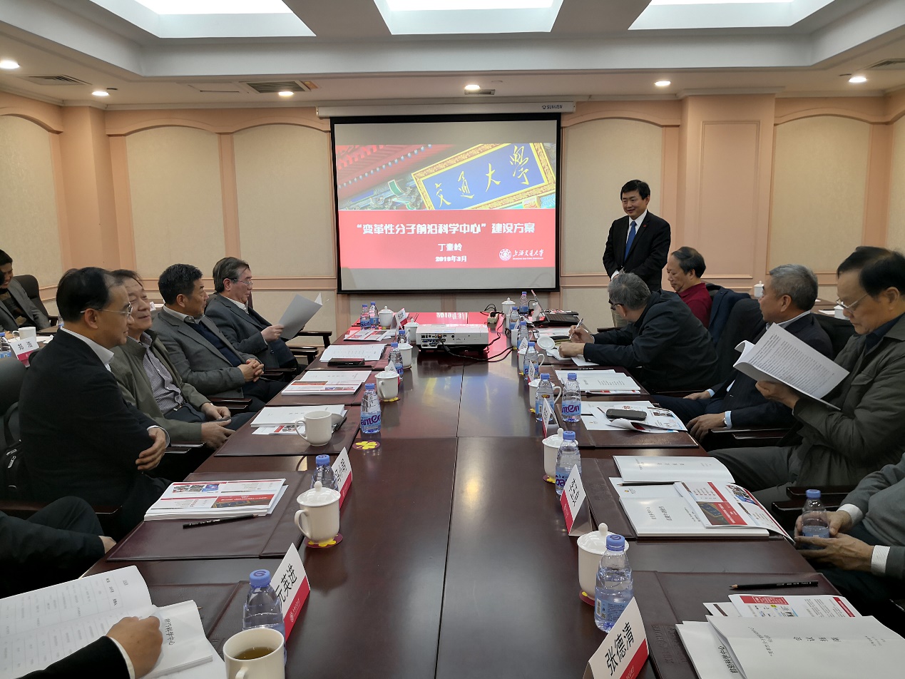 丁奎岭副校长向专家组汇报了“变革性分子前沿科学中心”的建设方案。他指出,前沿科学中心将以变革性小分子、大分子、超分子为研究主线,聚焦药物分子的创制、生物大分子的合成、细胞机器人的组装和功能等领域。希望通过汇聚上海交大相关领域的优秀人才,以解决“国家重大需求,促进科学进步,实现行业技术引领或改变人类生活”为目标,建成特色鲜明、国际一流的变革性分子前沿科学中心。。与会专家审阅了方案并进行了充分的讨论,一致认为“变革性分子前沿科学中心”面向未来,立足国际前沿,对引领国家创新发展意义重大,建设方案合理可行,一致同意通过论证。