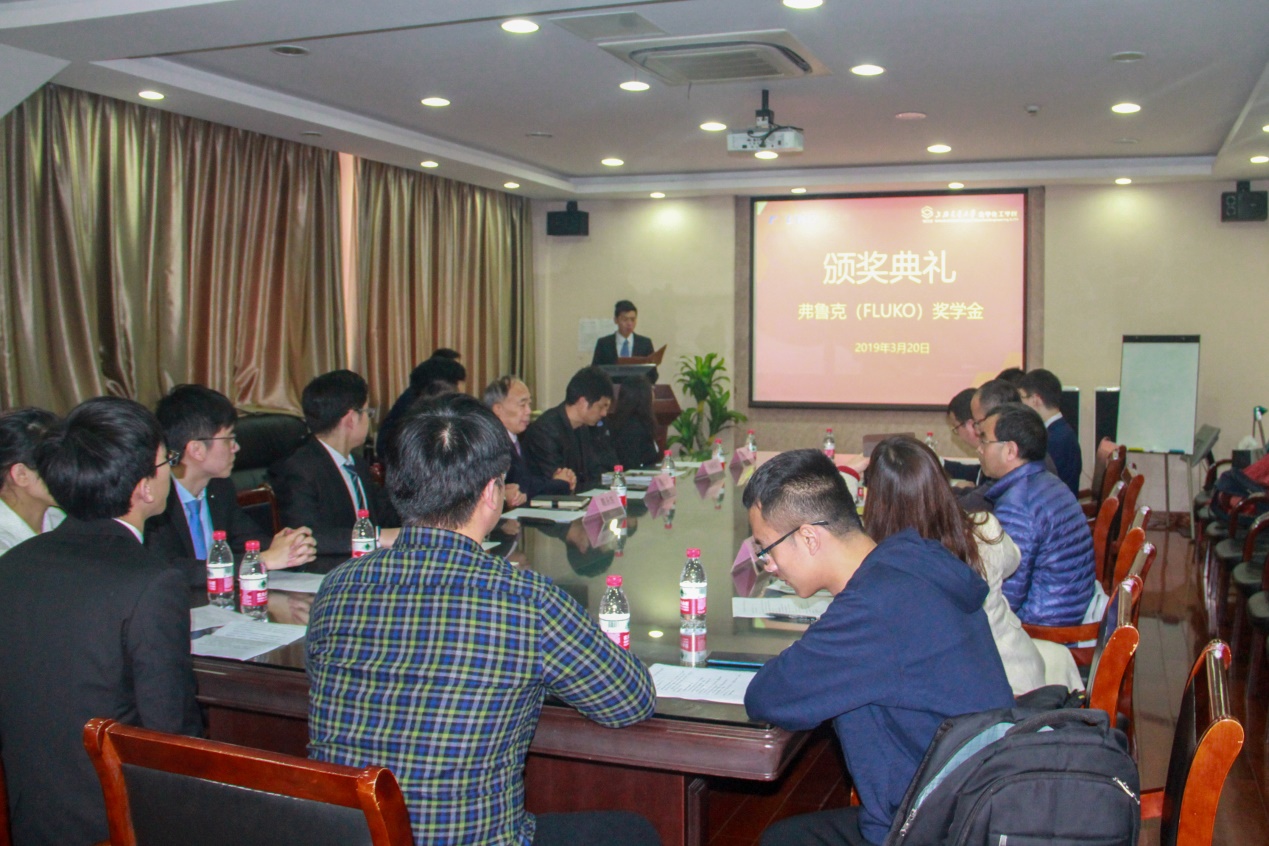 弗鲁克奖学金颁奖典礼在化学楼A楼518会议室举行。上海弗鲁克科技发展有限公司董事长周宏斌、总经理陈永东、技术部经理刘正洲、国际贸易部经理张斯滨、营运部经理袁鑫雷、学院党委副书记郑浩、学生事务负责人李安英、就业负责人周正、化工系副教授薛敏钊以及弗鲁克奖学金的获奖学生出席颁奖典礼,典礼由李致远主持。