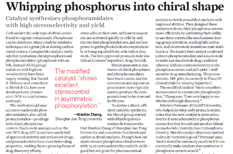 张万斌教授在手性双环咪唑骨架催化剂以及不对称磷酰化方面的原创性工作(J. Am. Chem. Soc., 2010, 132, 15939; Tetrahedron: Asymmetry, 2012, 23, 329-332),设计并合成了一种手性双环咪唑骨架的多功能催化剂,高立体选择性、高产率地实现了核苷类底物的不对称磷酰化,并将其应用于一类重要的三期临床新药核苷类前药MK-3682的高效合成中。与现有的有机小分子催化剂相比,张万斌团队首创的该类手性双环咪唑催化剂骨架可以通过廉价的咪唑和丙烯醛通过一步反应高收率地构建,易于大规模制备。美国化学会的国际著名新闻期刊“Chemical & Engineering News”(C&EN, 2017, 95, 5)和国内知名化学新闻网站“X-Mol”(www.x-mol.com/news/6043)分别于近日对此进行了亮点报道,并对张万斌教授进行了专访。