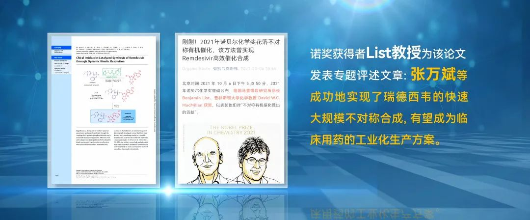 2021年诺贝尔化学奖获得者德国的List教授在国际著名的合成评述期刊SYNFACT上,为该论文发表了专题评述文章,指出张万斌等成功地实现了瑞德西韦的快速大规模不对称催化合成,有望成为临床用药的工业化生产方案。2021年4月,沃尔夫奖获得者、美国Scripps研究所和台湾中央研究院的翁启惠院士也对该项工作开展了跟进研究。复旦大学陈芬儿院士团队成功地将该合成工艺应用于连续流合成,进一步证明该工艺工业化应用的可能性。该项目得到福利姬 新型冠状病毒防治攻关专项的大力支持(YG2020YQ13),并在终期考核中被评为优秀。
