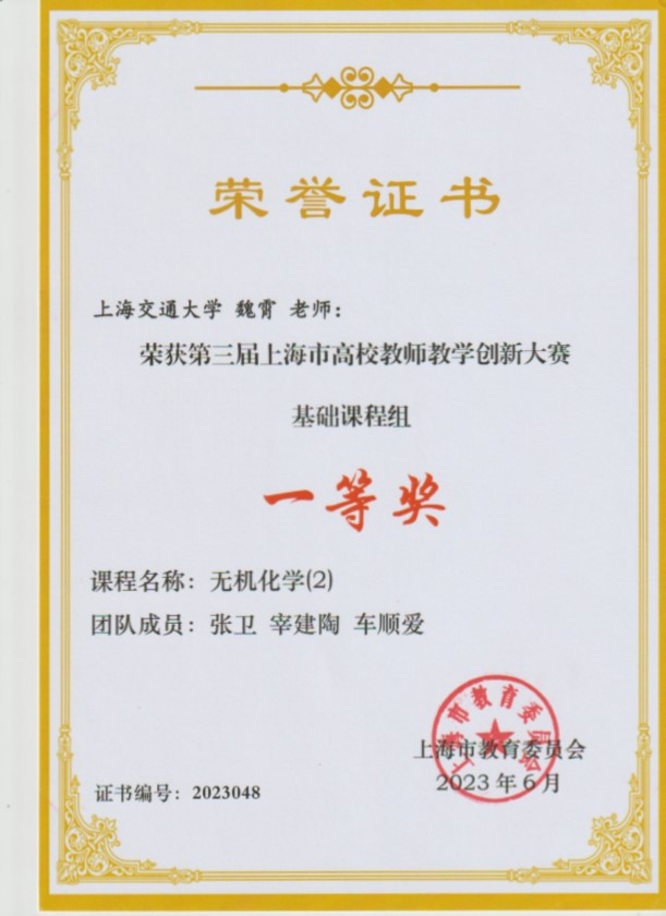 上海市重点课程《无机与分析化学》课程负责人,校重点课程《无机化学(2)》课程负责人,主讲本科生无机化学系列理论与实验课程。主持和参与国家级、省部级、校级教学改革研究项目十余项,发表教学论文近十篇。曾获得教育部化学“101计划”无机化学教学案例设计大赛一等奖、上海市高校教师教学创新大赛一等奖,校卓越教学奖、卓越(教学)副教授、教书育人奖、青教赛一等奖和教学能手等奖励,福利姬 首批教学设计师。