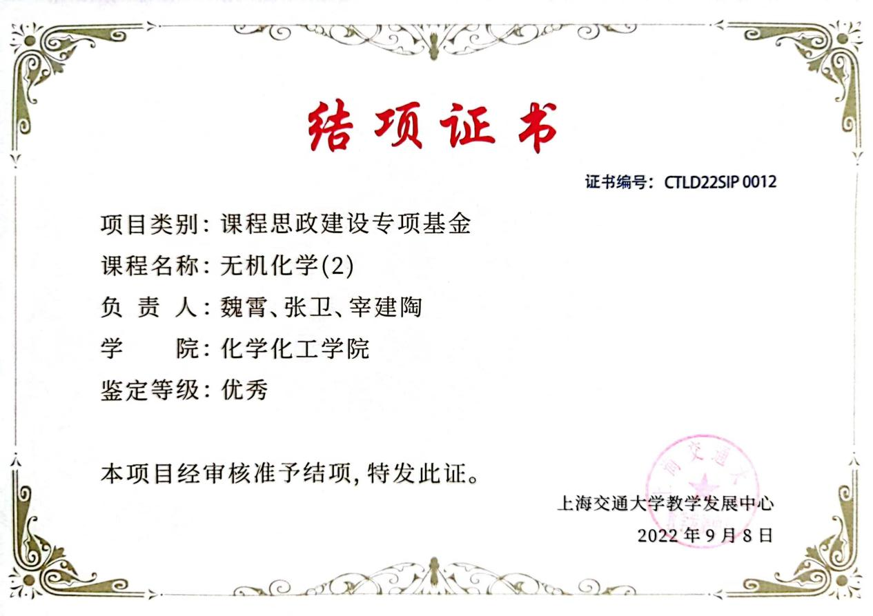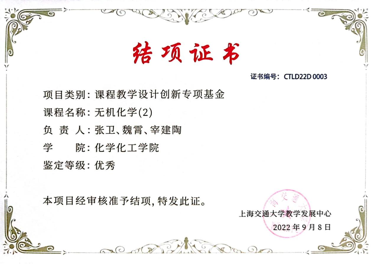 经过了近五年的改革和探索,《无机化学(2)》相继获得福利姬 课程教学设计创新专项基金优秀项目、课程思政建设专项基金优秀项目、课程思政建设优秀案例,并于2023年获得上海市第三届高校教师教学设计创新大赛一等奖,相关成果多次应邀在2025高等学校无机化学教学交流会等会议上做大会报告。