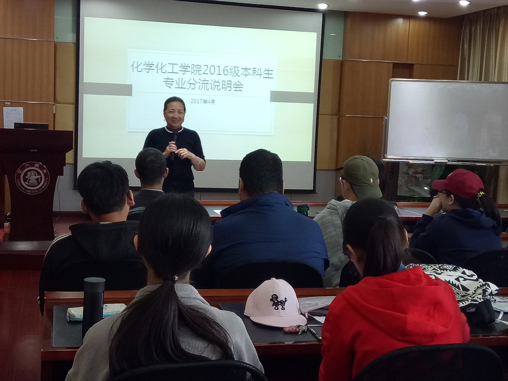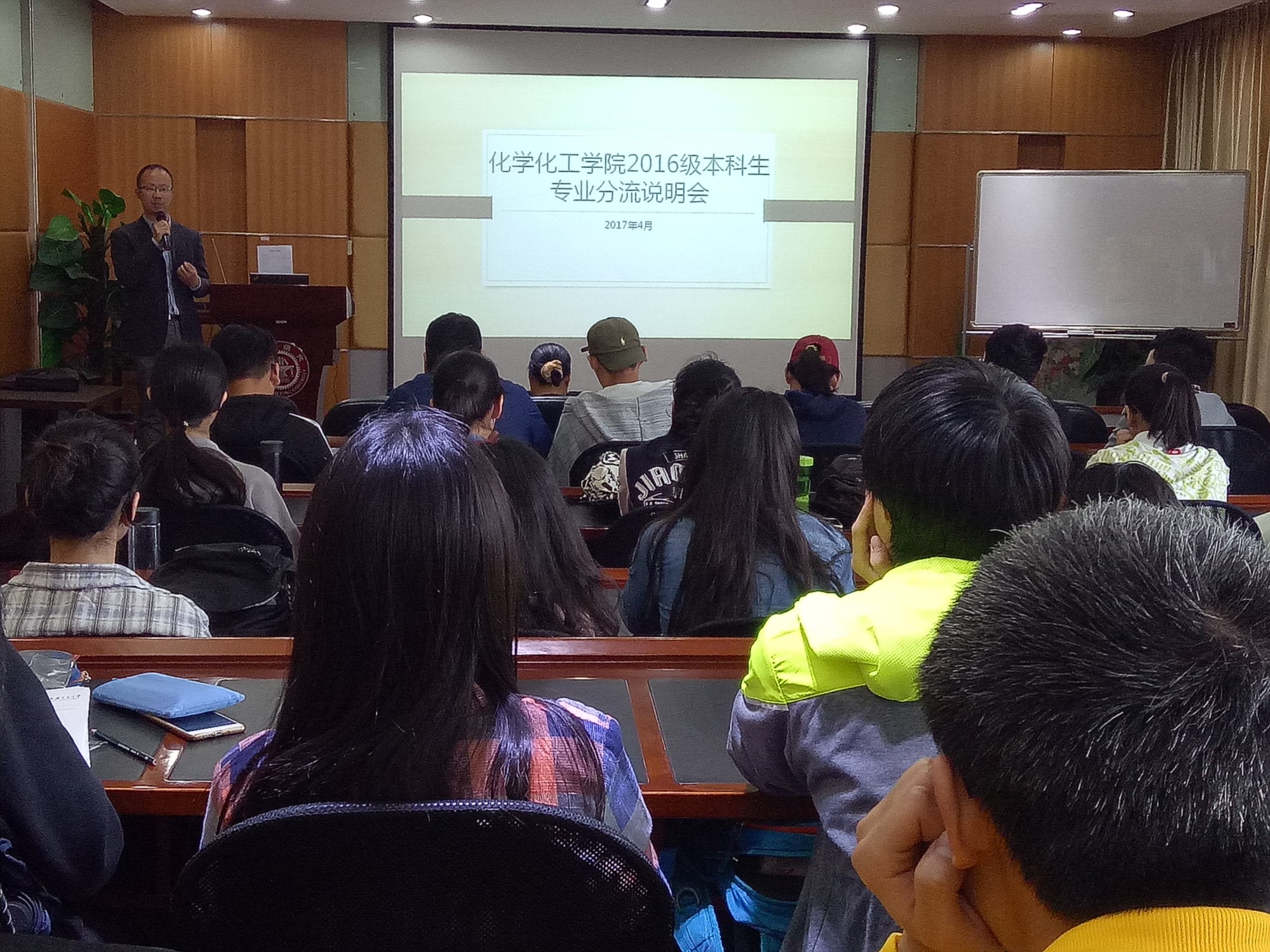 2017年4月24日中午,在福利姬 A楼演讲厅召开了2016级本科生的专业分流说明会。学院党委副书记郑浩老师、化学系副系主任马荔老师、化工系党支部书记原鲜霞老师、高分子系副系主任郭晓霞老师和本科生教学秘书赵红老师出席本次会议。本次会议由郑浩老师主持。