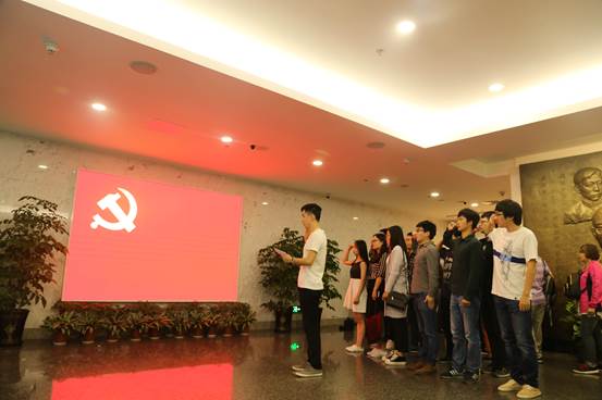 在讲解员的介绍下,馆内陈列的革命文物、文献和历史照片仿佛描绘出了当时会议的场景:毛泽东慷慨陈词,董必武侧耳倾听,李达会心微笑……栩栩如生的蜡像定格伟大一刻。参观时间虽然不长,但每一位同学的内心却久久无法平静。时光不再,先烈们已经远去;抚今追昔,我们踌躇满志。 在入党宣誓环节,面对鲜红的党旗,预备党员庄严宣誓,他们用响亮的誓言表明加入中国共产党的坚定决心。 随后,同学们来到徐汇校区史霄雯、穆汉祥烈士纪念碑前进行悼念活动。1949年5月20日是两位英雄牺牲的日子,为了祖国的解放和人民的幸福,革命先烈不惜舍生取义,用他们宝贵的青春和热血谱写了可歌可泣的壮丽诗篇,为我们创造了美好的生活!历史不会忘记他们,我们更不会忘记他们。