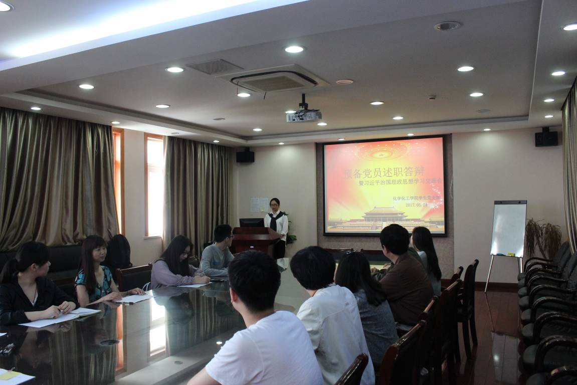 预备党员述职答辩暨习近平治国理政思想学习交流会在化学楼5楼会议室举行。学院关工委张斌老师、院学生党建工作负责人李安英老师、院党建联席会主席王雯、副主席章露枝和各党支书出席并担任评委,共有本硕博16名预备党员参加答辩。