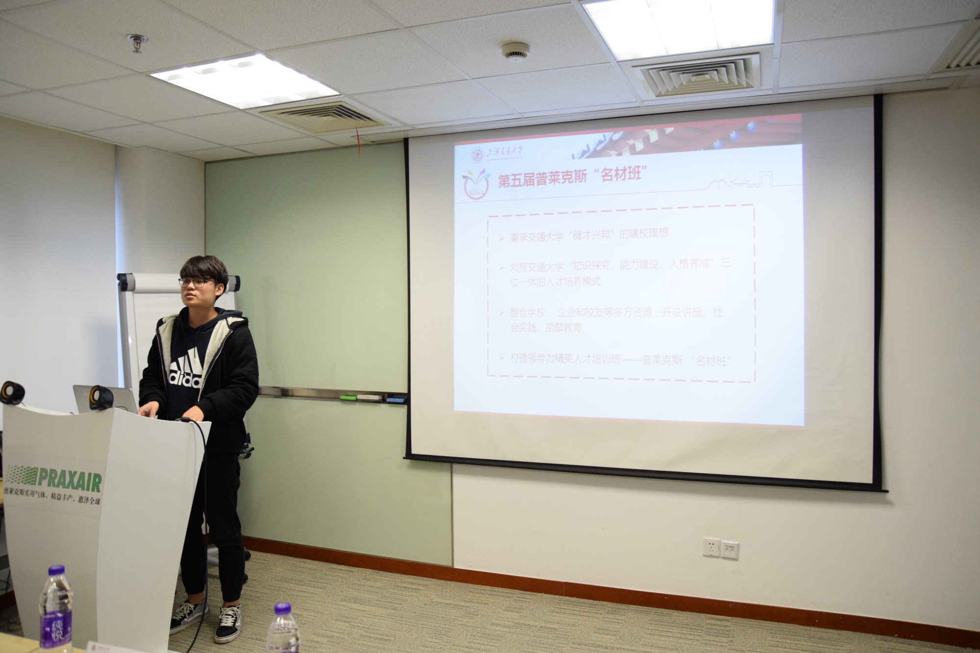 致辞。姚老师和大家分享了指导此次名材班的三点感悟,一是在班级活动准备中,同学们准备充足细致,表现了极大的自主性和责任心;二是在活动过程中,同学们热情积极,带着强烈的集体荣誉感;第三点要感谢普莱克斯集团自始至终地支持和帮助,同时期待着双方更加深入和愉快的合作。
