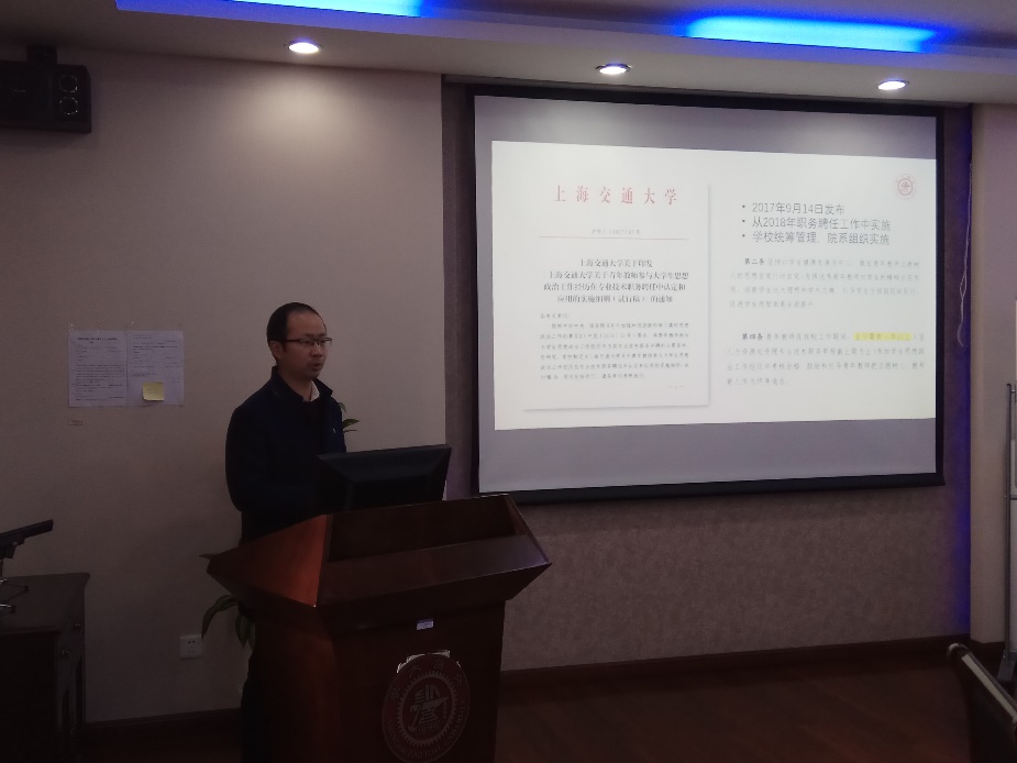 郑浩首先介绍了《细则》的相关规定:以学生健康发展为中心,激发青年教师立德树人,发挥优秀青年教师对学生的榜样示范作用,培育学生远大理想和学术志趣。《细则》指出,青年教师参加大学生思政工作的载体主要分为以下几类:担任本科生班主任、担任研究生班主任、担任本科生班导师、担任兼职思政教师、担任留学生辅导员、担任学生社团指导教师、担任学生莙政项目、担任挑战杯指导教师等。随后又介绍了福利姬