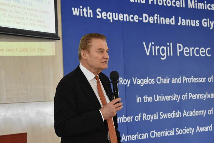 之后,Percec教授介绍了美国教育体制的特点以及宾夕法尼亚大学的教育、研究概况与国际地位。接下来,他介绍了生物膜的组成、形成机制及其重要的生理功能。他向听众介绍,虽然生物膜的功能非常重要,但是我们对其认知尚浅,主要原因是由于其组成过于复杂。因此,化学工作者有必要建立简单的人造模型,从而对其功能做出诠释,同时从其功能获取灵感,实现对生物膜的仿生与应用。紧接着,他总结了不同生物膜仿生体系,即人造囊泡的优劣势。人造囊泡包括通过磷脂分子得到的脂质体与通过两亲嵌段聚合物制备的聚合物囊泡。脂质体是从生物膜中获取的“半天然”结构,具有良好的生物兼容性,但是其化学结构单一,功能化难度大,稳定性不够,而且受外部干扰易破裂。聚合物囊泡虽然能解决上述技术瓶颈,但是囊泡壁厚与生物体系不兼容,很难实现有效的生物应用。这些人造囊泡体系存在的不足也正是Percec教授团队试图寻求新的仿生模型的动力。有幸的是,Percec教授于2010年发现,通过低代两亲树状分子在水相中的自组装,可以得到尺寸非常均一的人造囊泡。这些囊泡具有与生物膜相仿的机械性能与稳定性,其壁厚也可以调整,从而实现与生物膜壁厚的兼容。更重要的是,这类囊泡的制备过程非常简单,有利于其大规模的制备与应用。在近期的研究工作中,Percec教授课题组将具有生物活性的糖修饰于人造囊泡的表面上,巧妙地模拟了糖在生物膜表面上的空间分布。基于此,该团队成功地通过上述仿生模型诠释了糖在生物膜上的合理空间展示(spatial display)的重要性,并发现了这种空间排布有利于糖与凝集素(例如来自人体的半乳糖凝集素等)之间相互识别的增强。更为重要的是,该团队利用此类生物膜仿生模型诠释了一系列与人体凝集素高度相关的疾病的致病机理。