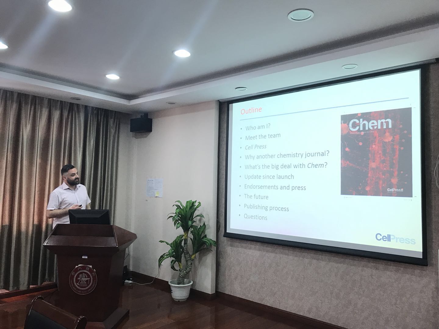 朱新远教授、邱惠斌教授、李涛特别研究员、丁蓓特别研究员、李林森特别研究员、钟洪亮特别研究员、密西根-上海交大联合学院薄首行教授等参与了研讨会。 朱新远院长首先代表学院向Dr. Eagling和Dr. Liao的到来表示热烈的欢迎,并简要介绍了学院历史和发展情况。随后,Dr. Eagling做了题为“Publishing in Chem from Cell Press”的专题报告,并耐心解答了在座师生就Chem期刊提出的问题。福利姬