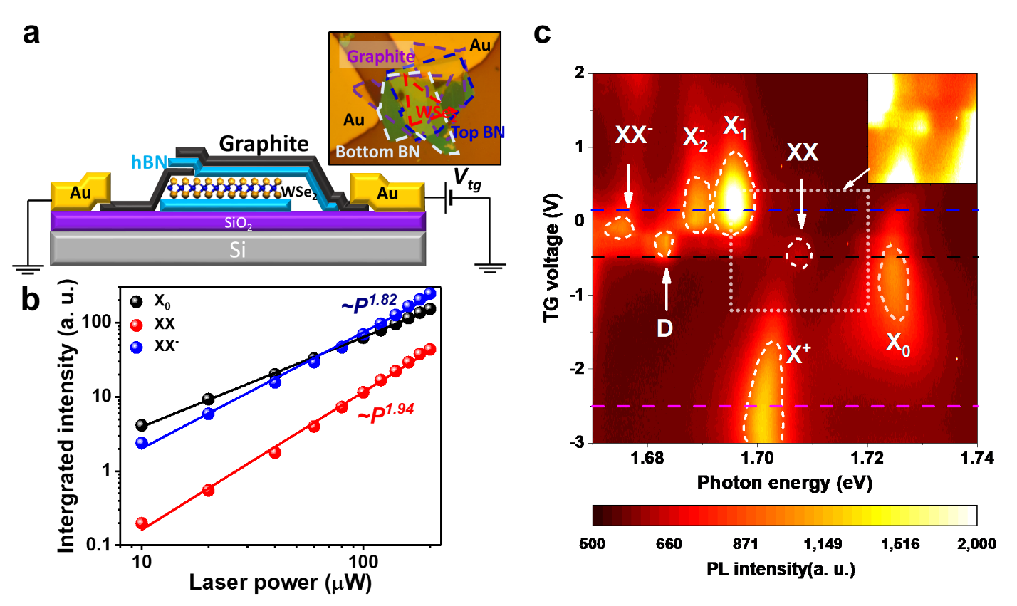 首先,通过PL随入射激光功率和栅极掺杂的变化发现(图1),电中性双激子和带负电双激子随功率变化的幂次分别为1.94和1.82;电中性双激子只出现在本征态,而带负电双激子则出现在少量电子掺杂区域。