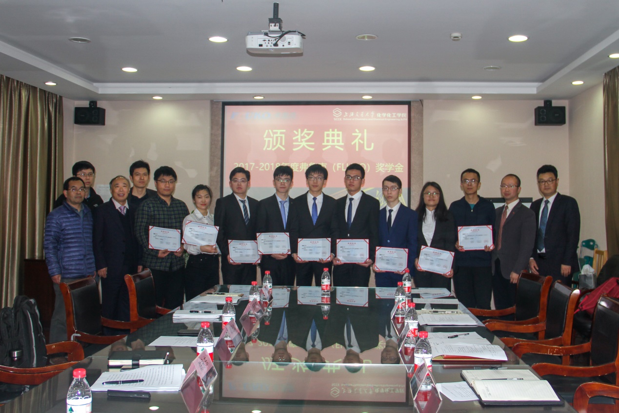 弗鲁克奖学金颁奖典礼在化学楼A楼518会议室举行。上海弗鲁克科技发展有限公司董事长周宏斌、总经理陈永东、技术部经理刘正洲、国际贸易部经理张斯滨、营运部经理袁鑫雷、学院党委副书记郑浩、学生事务负责人李安英、就业负责人周正、化工系副教授薛敏钊以及弗鲁克奖学金的获奖学生出席颁奖典礼,典礼由李致远主持。