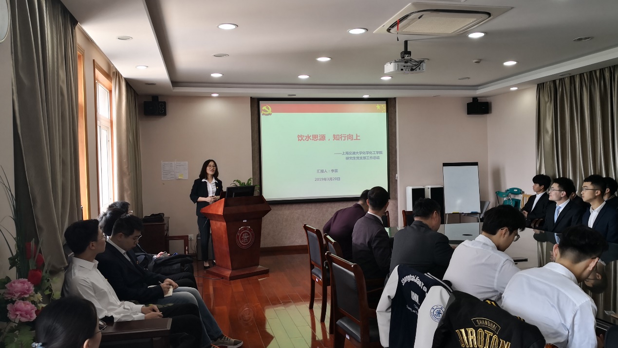 在庄严的国歌声后,李蕊代表研究生支部作了“饮水思源,知行向上”的工作总结。她从“对内建设”、“对外服务”、“建设成果”等方面进行汇报,重点突出了支部的特色工作。研究生党员在科研上吃苦耐劳,在生活中甘于奉献,是一支优秀的学生党员队伍。