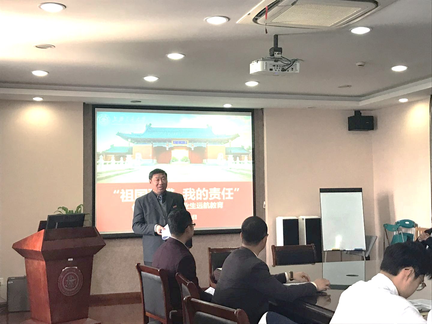 随后,贾金平书记为同学们作“祖国强盛,我的责任”远航教育报告。人生会有无数次选择,毕业是其中一个关键的分岔路口。贾书记从徐名材、史霄雯、蔡力宏三位学长在毕业之际的选择出发,告诉我们如何成为新时代的人才。徐名材先生要求孩子放弃舒适的洋行工作,选择打拼中国人的实业;史霄雯烈士放弃平静的生活,选择争取新中国的道路;蔡力宏学长放弃现有的职业和地位,选择奋斗国家需要的职业。“饮水思源”要我们常怀感恩之心,“爱国荣校”是要我们多为国家和民族谋福利,只有将个人的小我融入到祖国的大我,才能像三位学长那样不断探索和发展自己的职业生涯,成为新时代的弄潮儿。
