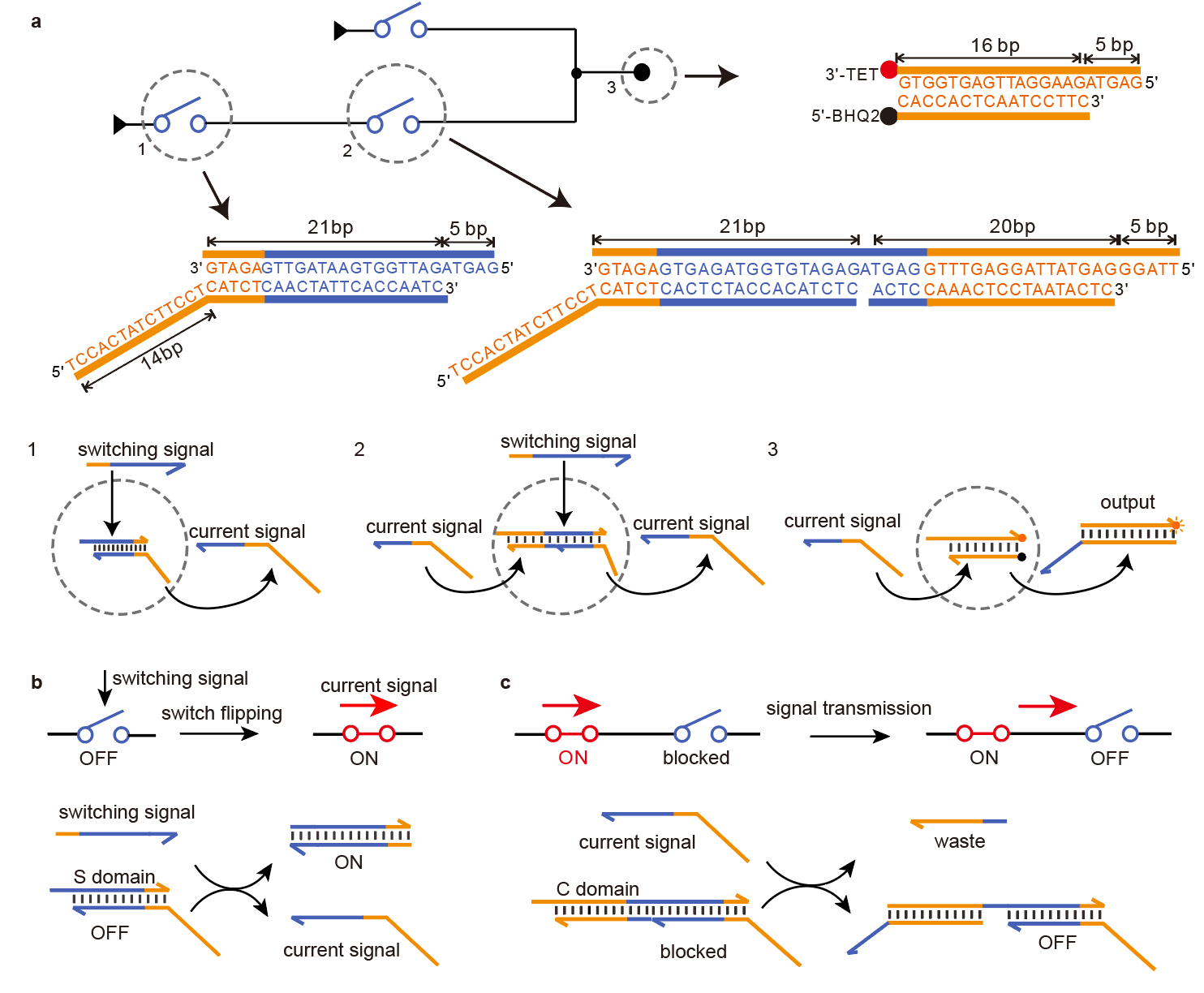 DNA计算旨在利用DNA分子反应来实现数字运算功能,是生物计算领域的重要组成部分。特别的,DNA链置换反应为构建常温下运行的复杂数字电路提供了重要工具。DNA链置换反应是利用DNA分子杂交的自由能差异,以一条单链序列将另一条单链从杂交DNA双螺旋结构中取代下来用于后续反应,具有精确的序列正交性。然而,迄今为止的DNA数字运算电路均基于逻辑门来实现,电路较为复杂,而随着参与反应的DNA链数目增加,其运算速度和信噪比均受到限制。而开关电路则是由信息论创始人香农(Claude Elwood Shannon)在在电子电路发展的早期阶段就提出来的一种方法,可以高效、经济地实现任意数字功能,是构成现代通讯的基础。受此启发,樊春海团队提出了一种模块化的DNA分子开关,通过构建DNA开关电路在实验上实现了任意功能的数字运算。 类似于电子开关电路,该DNA开关电路通过开关信号控制电流信号的传输,电流信号传输的方向可以通过反应路径中分子自由能的差异来精确控制。上游开关仅具有S结构域响应开关信号,而下游开关具有C结构域和S结构域分别响应上一级的电流信号和自己的开关信号。其中,S域实现功能控制,C域实现电流信号传输。利用DNA分子开关,他们设计了一个功能完备的“开关画板”,任意的逻辑功能均可通过真值表到“画板”上电流通路的映射实现。该DNA开关电路在实验上可实现包括简单逻辑运算、扇入扇出结构、复杂组合逻辑电路、全加器、4 bit开根号运算等多种电路结构和功能。所有电路的运算时间均在10分钟以内,展示了迄今为止最快的复杂DNA数字运算。 DNA开关电路作为一种新的DNA计算体系实现方式,为发展分子计算机和开发具有综合决策能力或复杂行为能力的纳米机器奠定了基础。 撰稿:樊春海团队