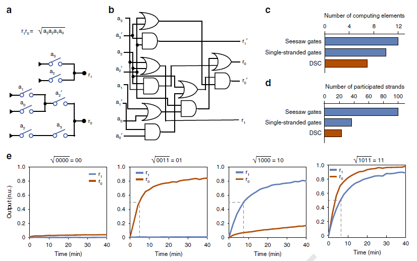化学与化工学院樊春海团队开发了一种基于DNA链置换反应的开关电路来实现数字运算。与常用的逻辑门电路相比,开关电路结构精简,可以用最少的DNA序列实现高信噪比和快速计算的分子电路。他们展示了迄今为止最为快速的4位平方根运算。相关论文以“Implementing digital computing with DNA-based switching circuits”为题发表于Nature Communications (//www.nature.com/articles/s41467-019-13980-y).王飞和吕慧为共同第一作者,樊春海和中国科学院上海高等研究院和上海应用物理研究所王丽华为共同通讯作者。