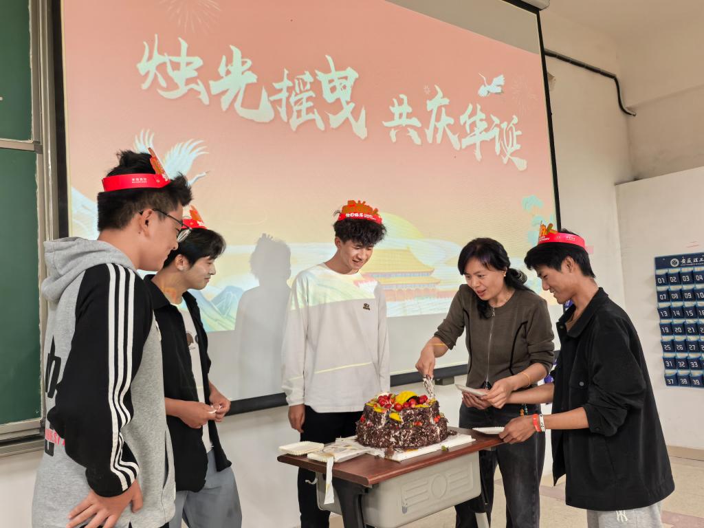 领导与辅导员共同为入学以来至国庆假期过生日的同学们举办了一场温馨的集体生日会。在烛光摇曳中,师生共同分享生日蛋糕,齐声唱响《生日快乐》和《歌唱祖国》。