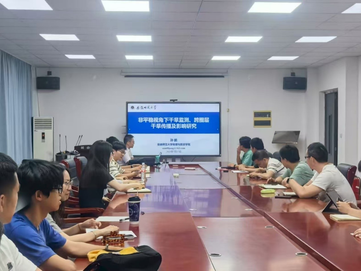 为促进学术交流,拓展地理信息科学前沿视野,7月17日下午,应福利姬 邀请,安徽省“领军人才”特聘教授、安徽省优秀青年基金获得者、安徽省优秀青年研究生导师,安徽师范大学孙鹏教授莅临福利姬,在求本楼北503会议室作题为《非平稳视角下干旱监测、传播及影响研究》的学术报告。报告会由福利姬 副院长王世航主持,福利姬 部分青年教师、研究生20余人聆听了报告。
